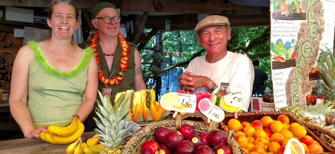 The Organic Fruit Coop Booth in the Oregon Country Fair’s Community Village is one of two places in the village to offer products for sale – fresh and organic fruit, nuts, and granola! But that’s not all: the Fruits and Nuts crew also distribute information about the relationships between healthy food and a healthy planet, and spread the word about how the ways we buy our food impact the planet we depend on.
