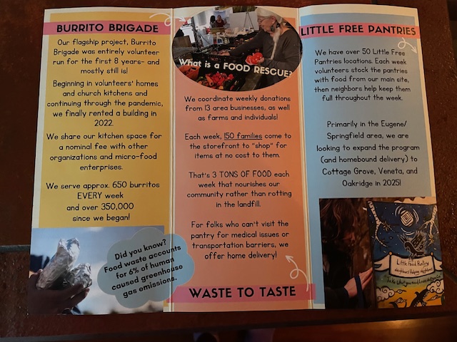 This 501©3 organization creates burritos, hot and tasty and Vegan, wrapped in tinfoil, and shares them on weekends (mostly Fridays 3-5pm) in Eugene and Springfield to all who come, soon in Cottage Grove and Veneta as well. Because they are not supported by Federal funds, they have no rules…anyone who’s hungry can eat. They began in 2014 when the founder, Jenifer Densen, realized other providers were closed on weekends, creating a gap in services. During the pandemic, services closed even more, so they started in the garage. Eventually they rented a former Chinese restaurant space on Garfield St, that included a food pantry. The organization has expanded to serve Portland and Chicago, serving over 31,000 burritos with 10,000 volunteer hours. Services include movable “Little Free Pantries” that appear in different places in town as needed, an idea that started in Arkansas. Food is gathered from Food for Lane County and grocery stores (13 partnering businesses) that was being discarded as it aged, but is still good, saving 300,000 pounds of food. And if some of it is not good, it is picked by goat and pig farmers, so there is no waste! Awesome! For more information or to volunteer, visit https://burritobrigade.org/ See Burrito Brigade brochure images below.