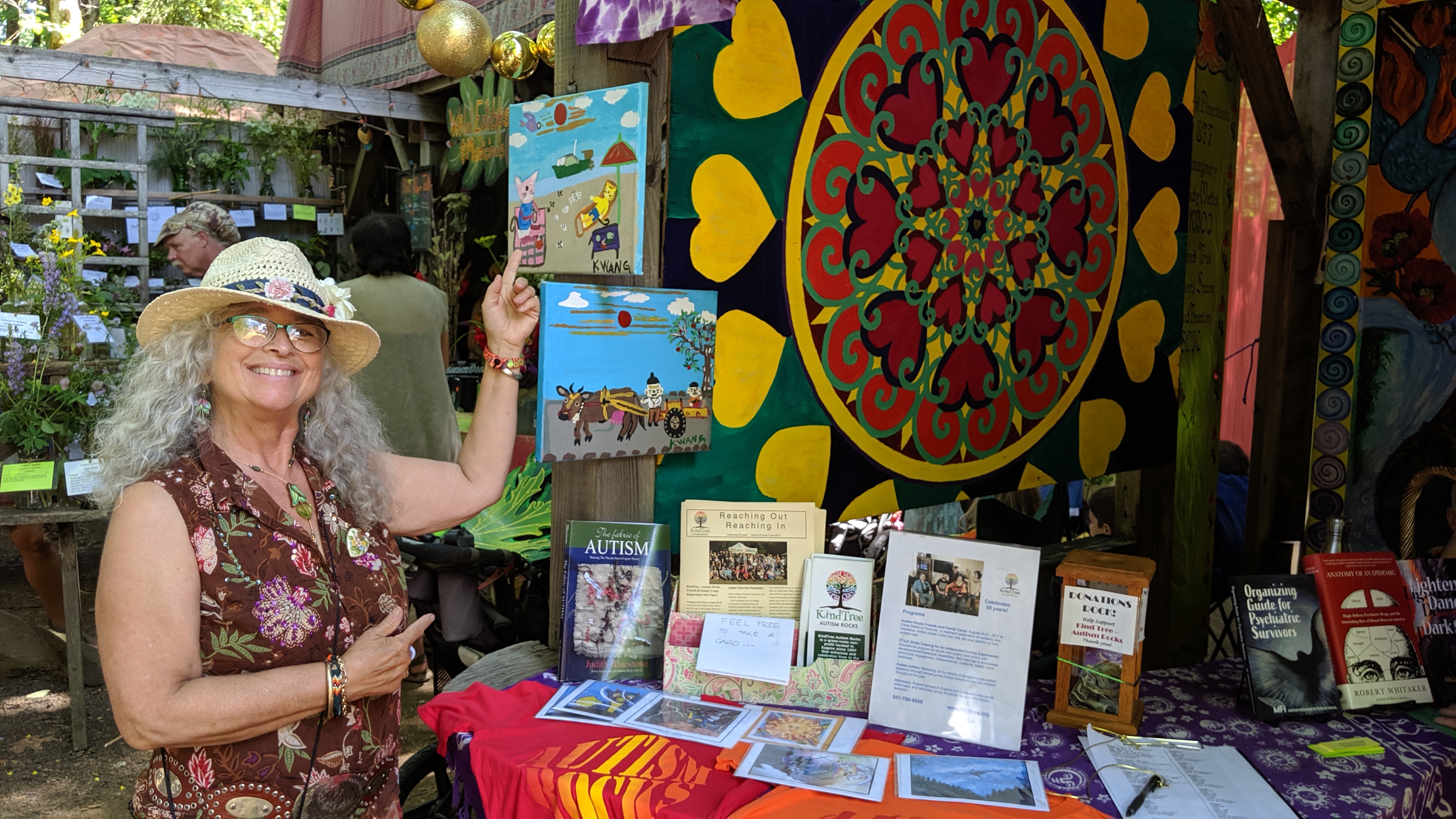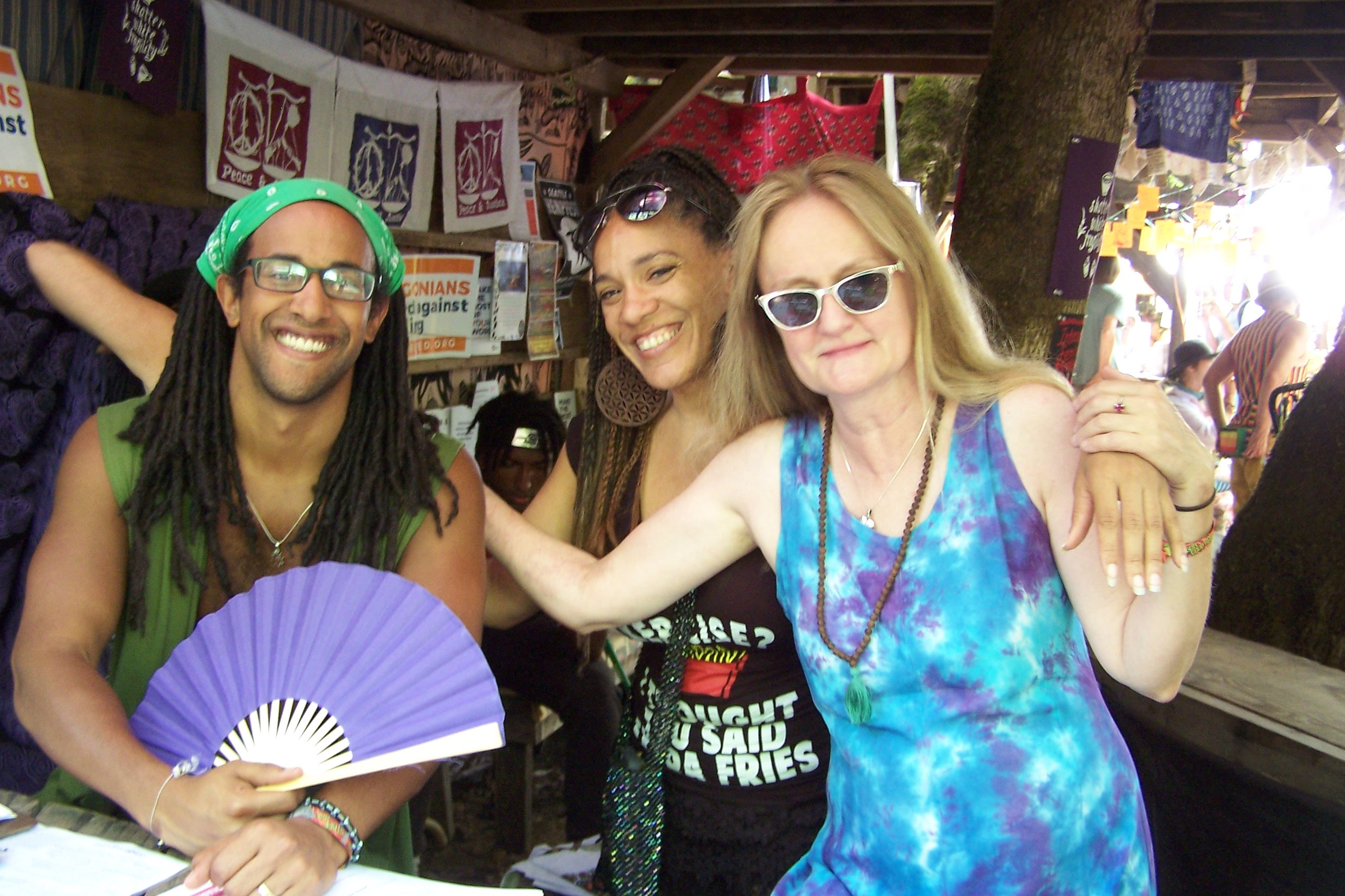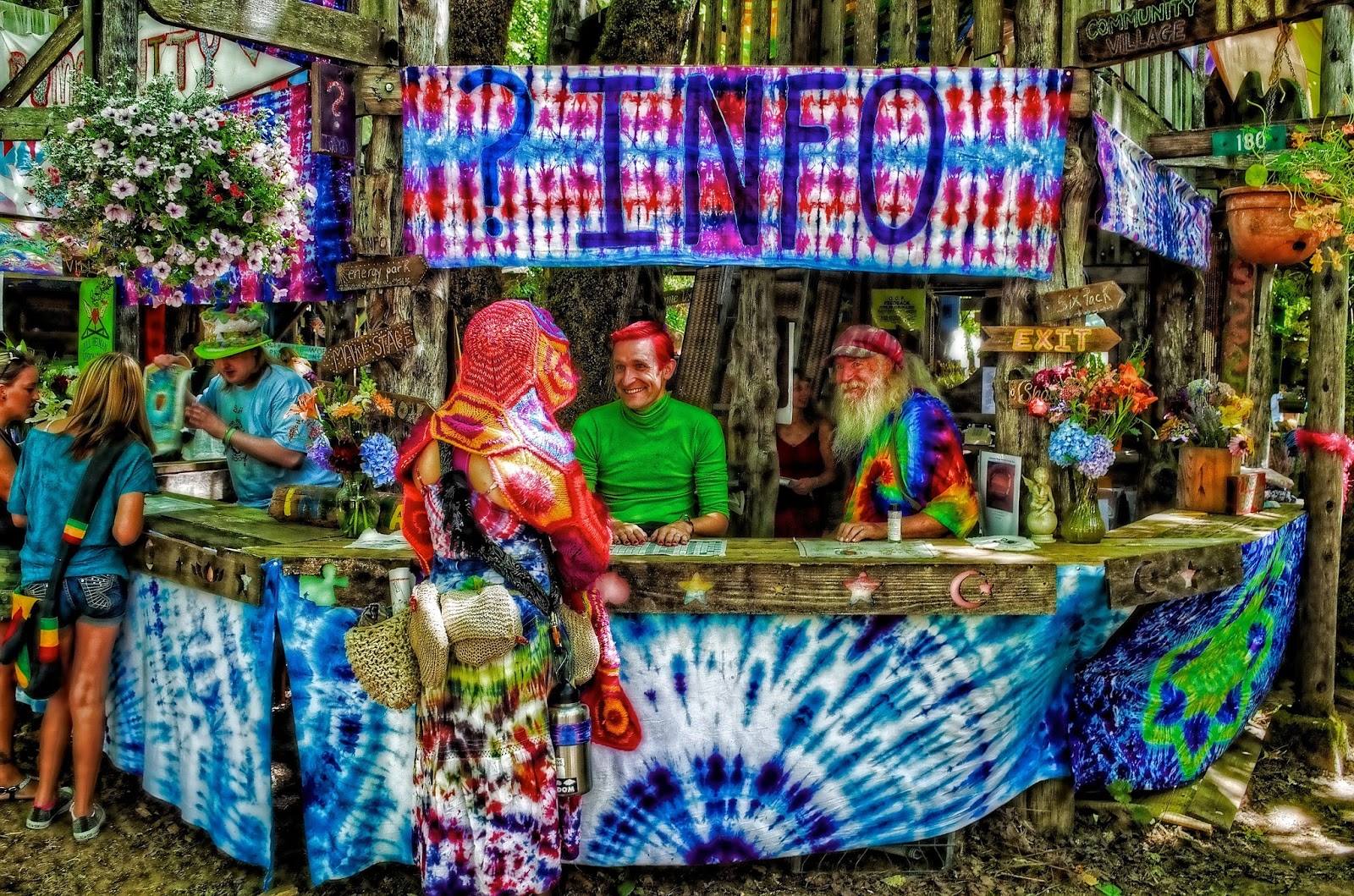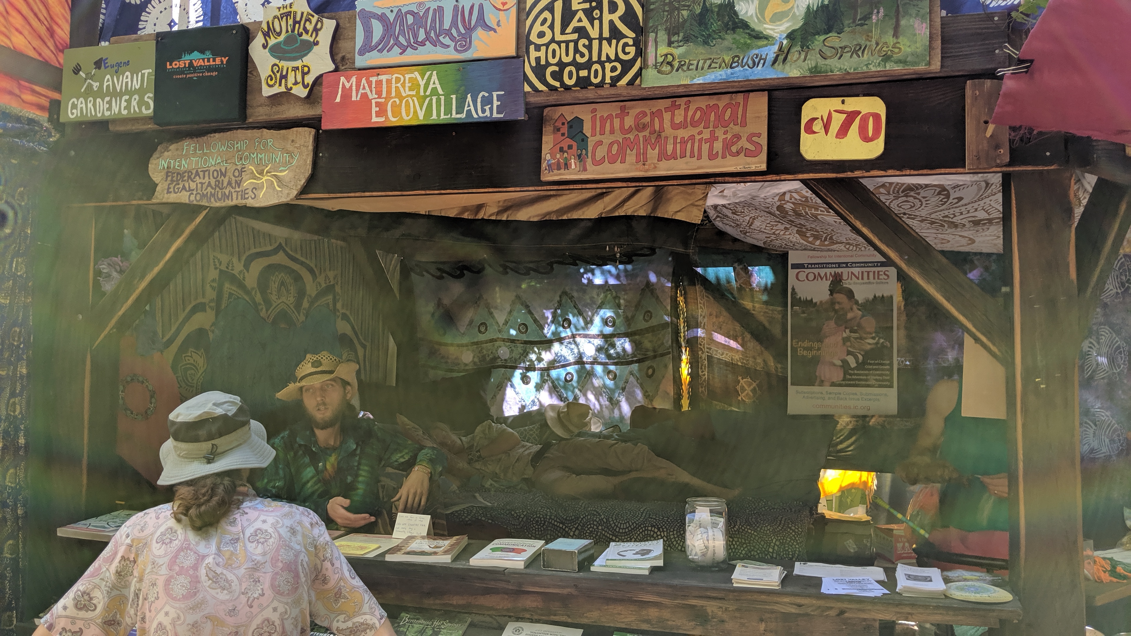 The Intentional Communities booth, to the right of the Village Stage, is staffed by representatives from a variety of communities of choice, residence, and